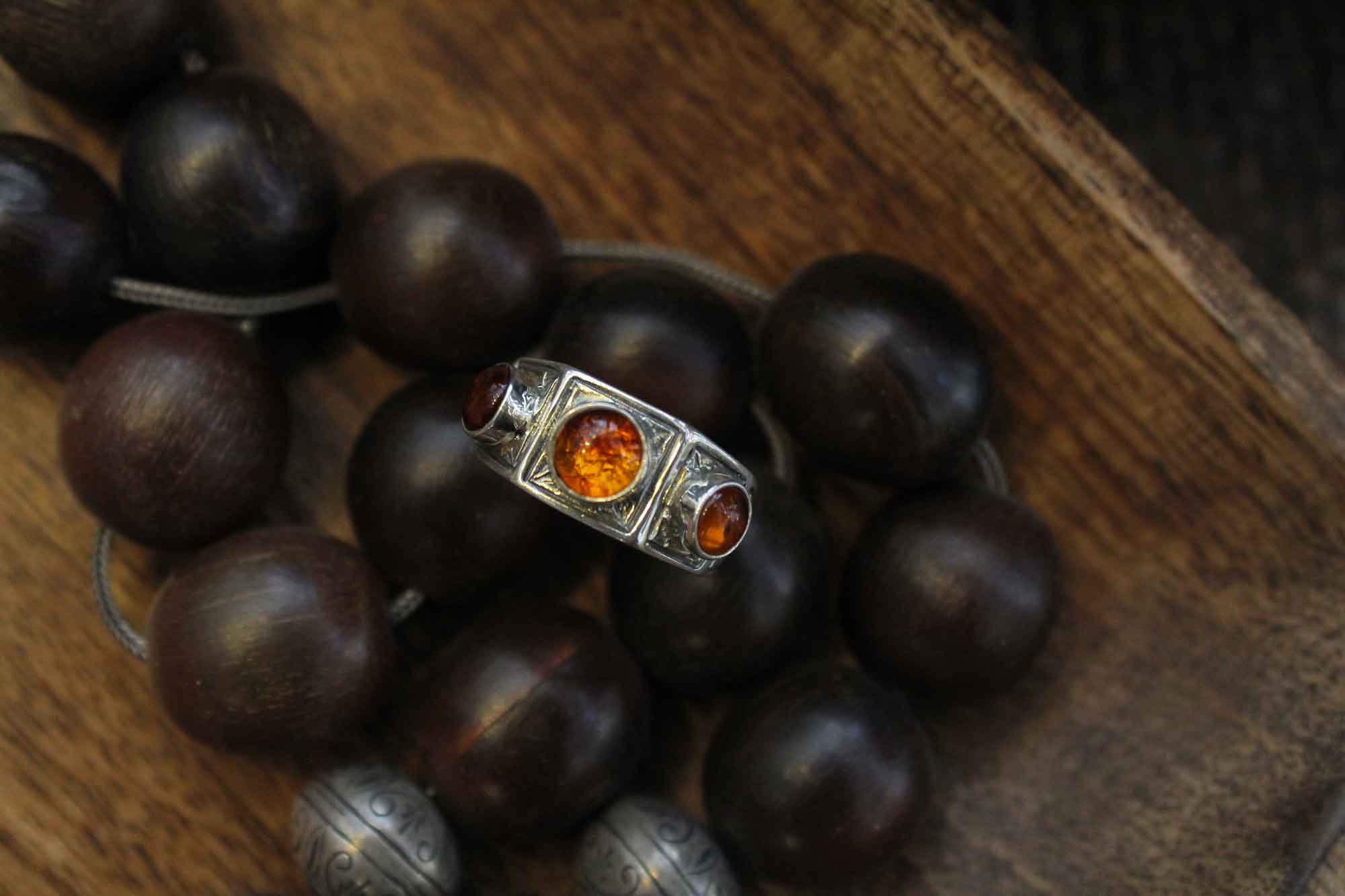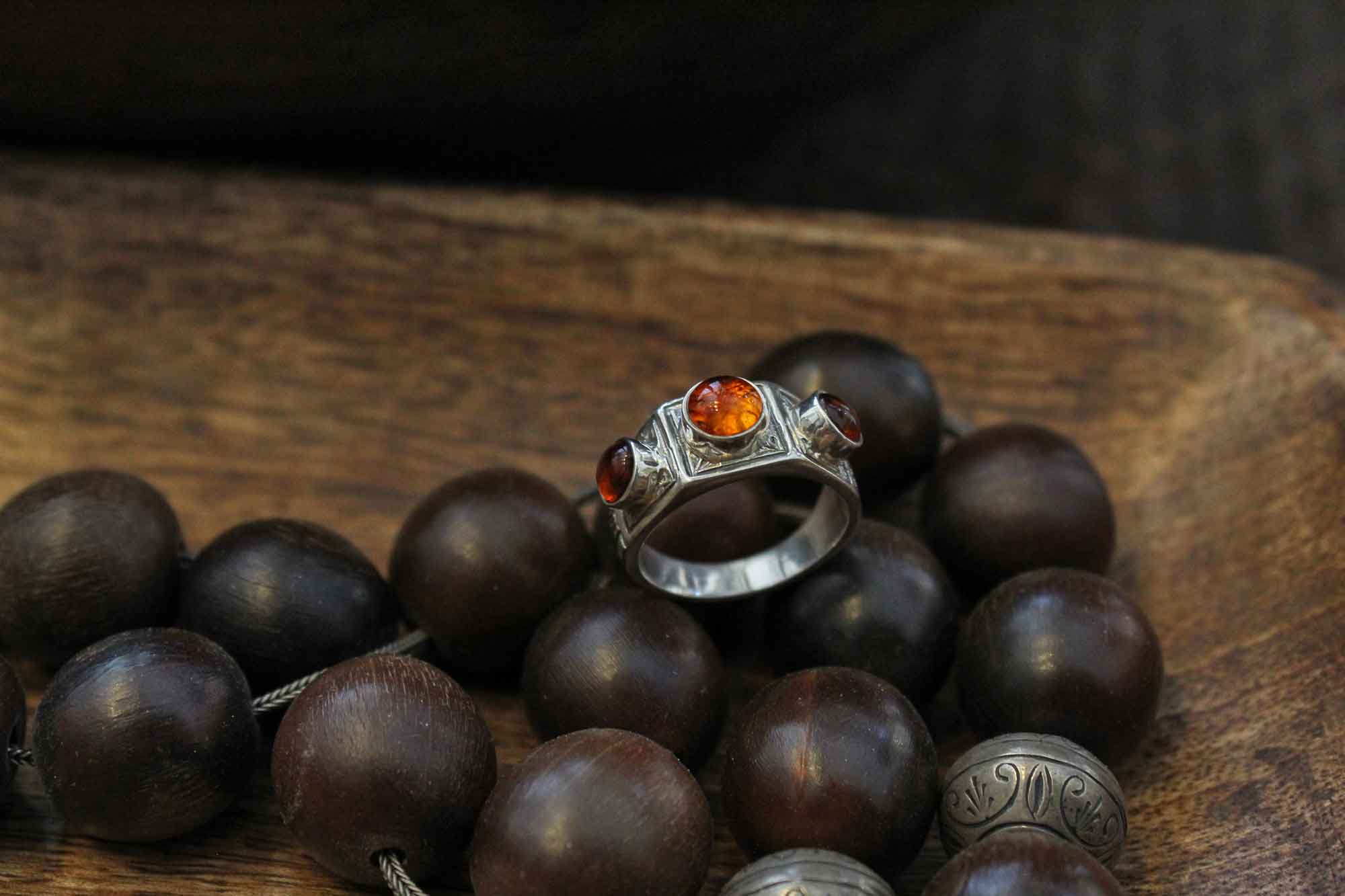 SAVATI Jewelry χειροποίητο δαχτυλίδι κατασκευασμένο από ασήμι με εγχάρακτο σχεδιασμό και τρεις υπέροχες πέτρες κεχριμπαριού στην κορυφή του!