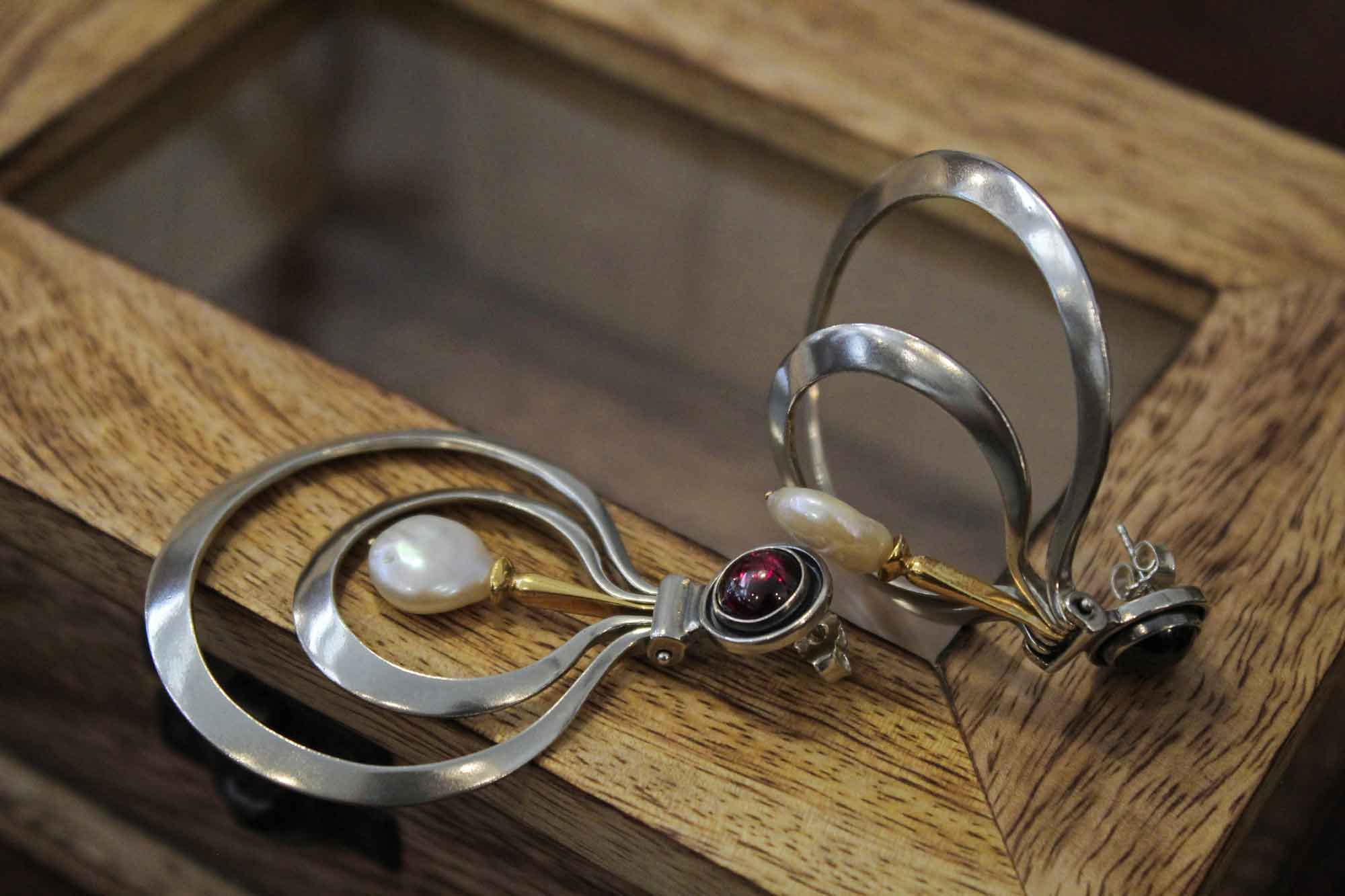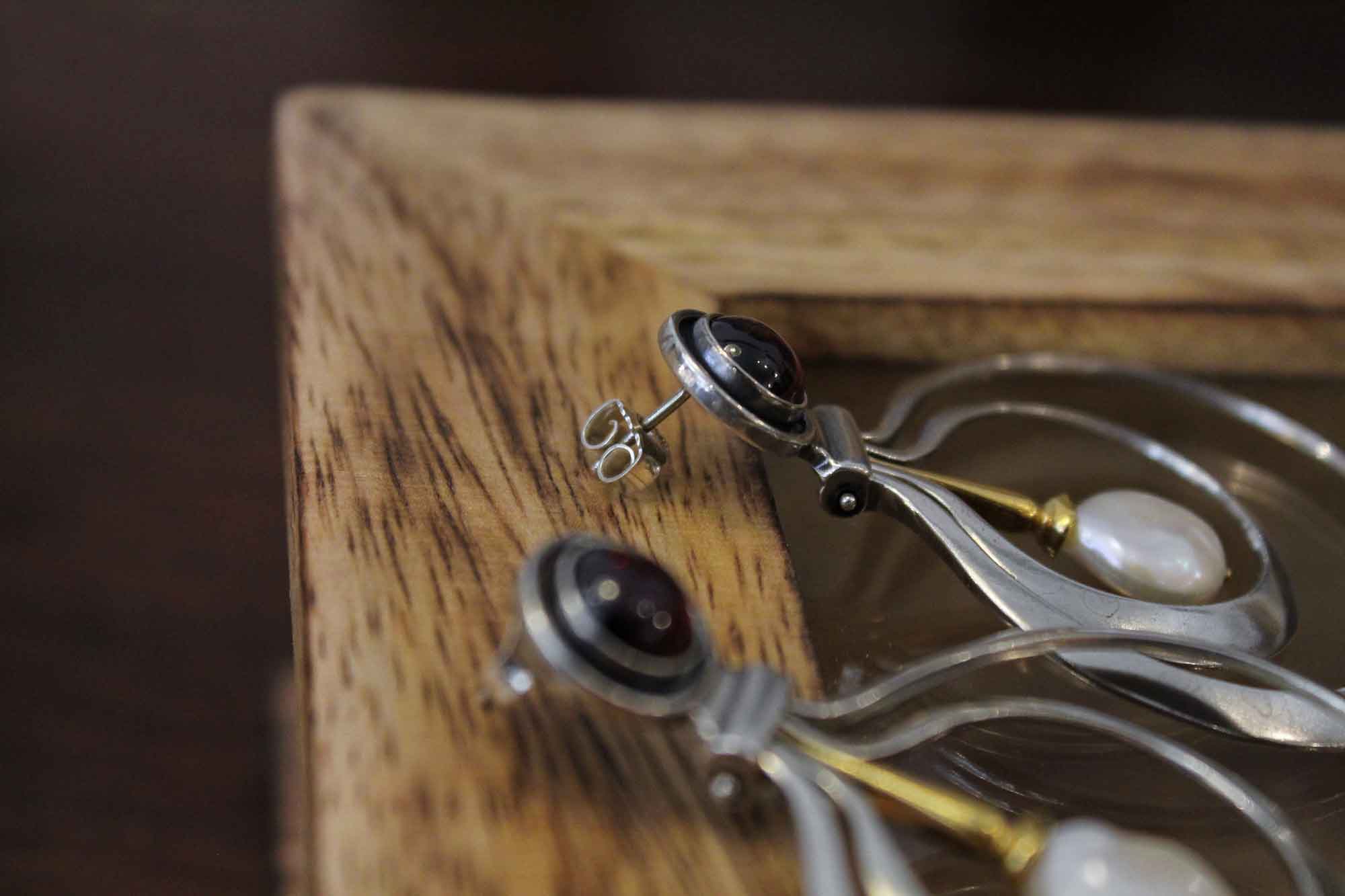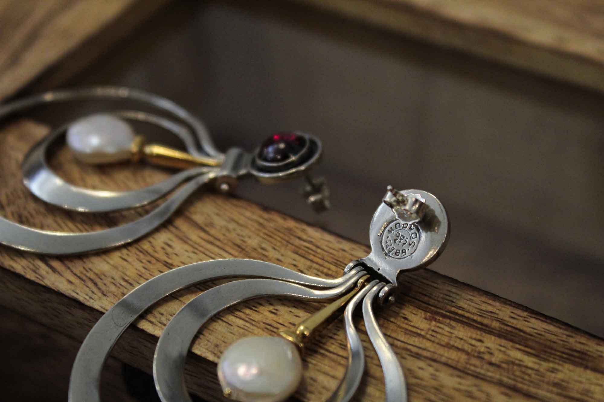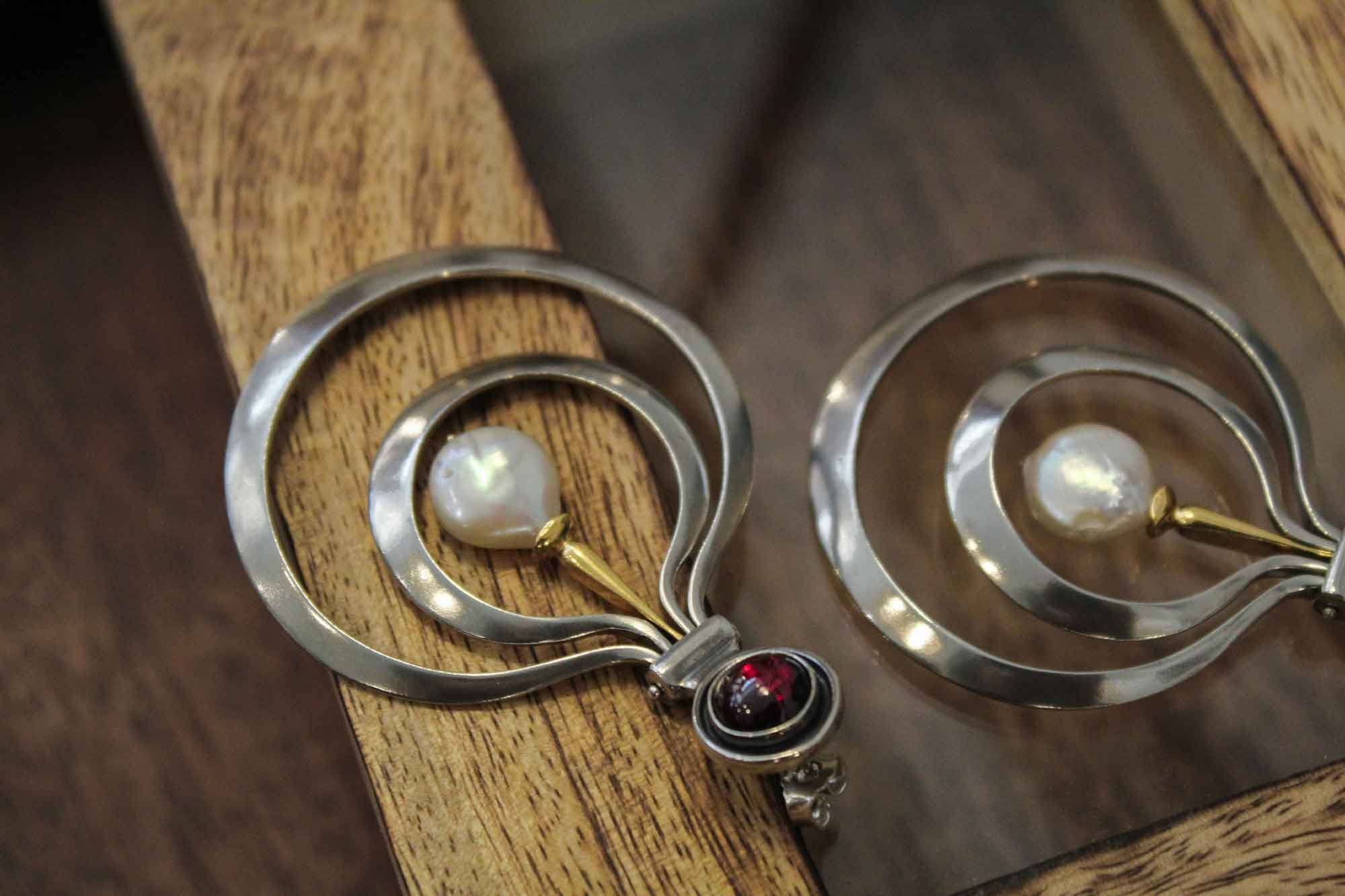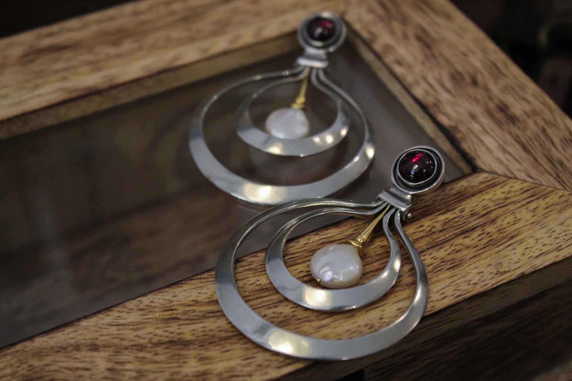 Koukos Jewellery χειροποίητα σκουλαρίκια σε μοναδικό σχεδιασμό κατασκευασμένα από ασήμι με επίχρυσα μέρη. Κοσμούνται με πετρώματα από γρανάδα και δύο στρογγυλά πλακέ μαργαριτάρια καλλιέργειας.